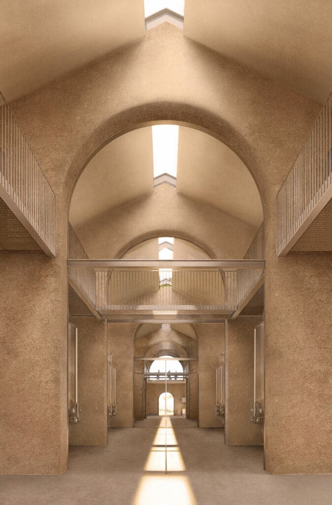 La cidrerie conserve le gabarit du bâtiment existant et se compose d'une nouvelle enveloppe en béton de chanvre projeté. L'ensemble est laissé brut.